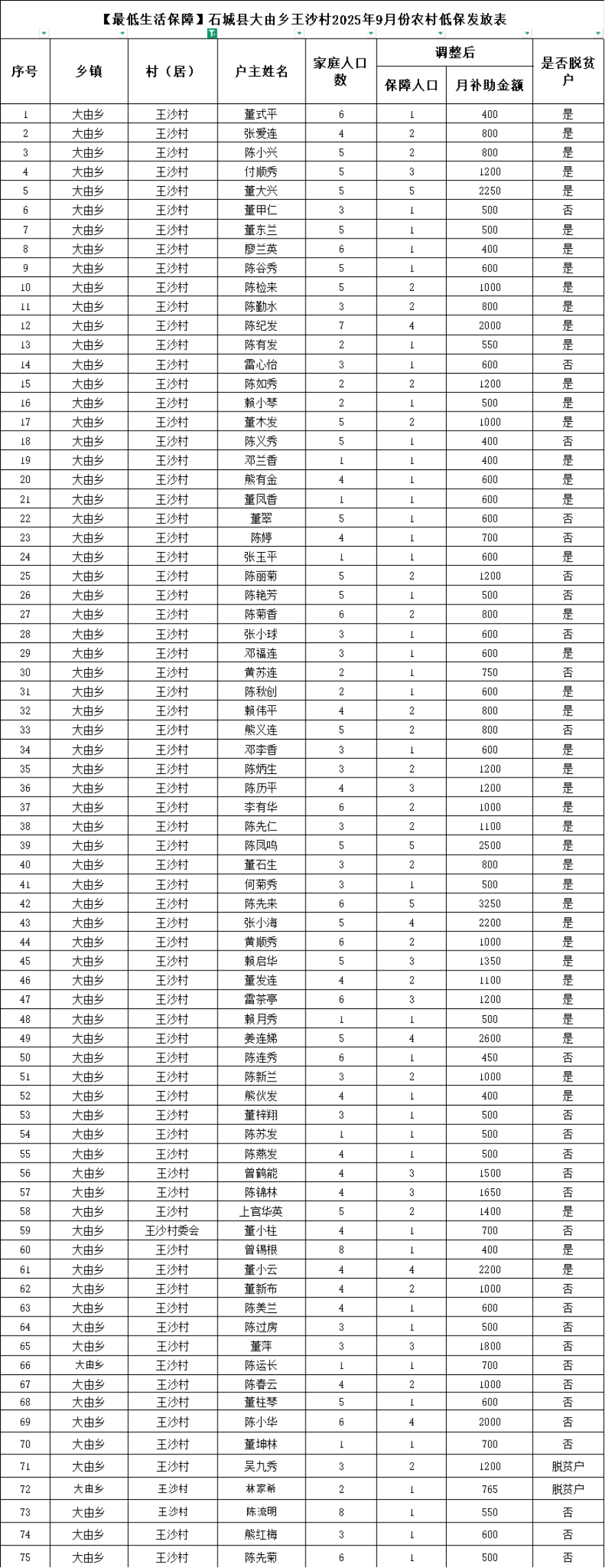 【最低生活保障】石城縣大由鄉(xiāng)王沙村2025年9月份農(nóng)村低保發(fā)放表