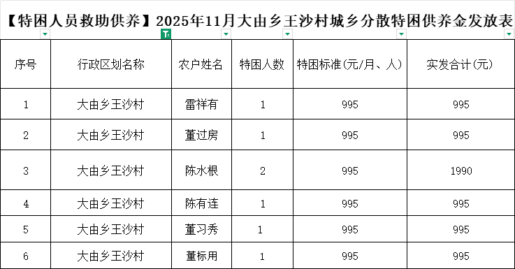 【特困人員救助供養(yǎng)】2025年11月大由鄉(xiāng)王沙村城鄉(xiāng)分散特困供養(yǎng)金發(fā)放表