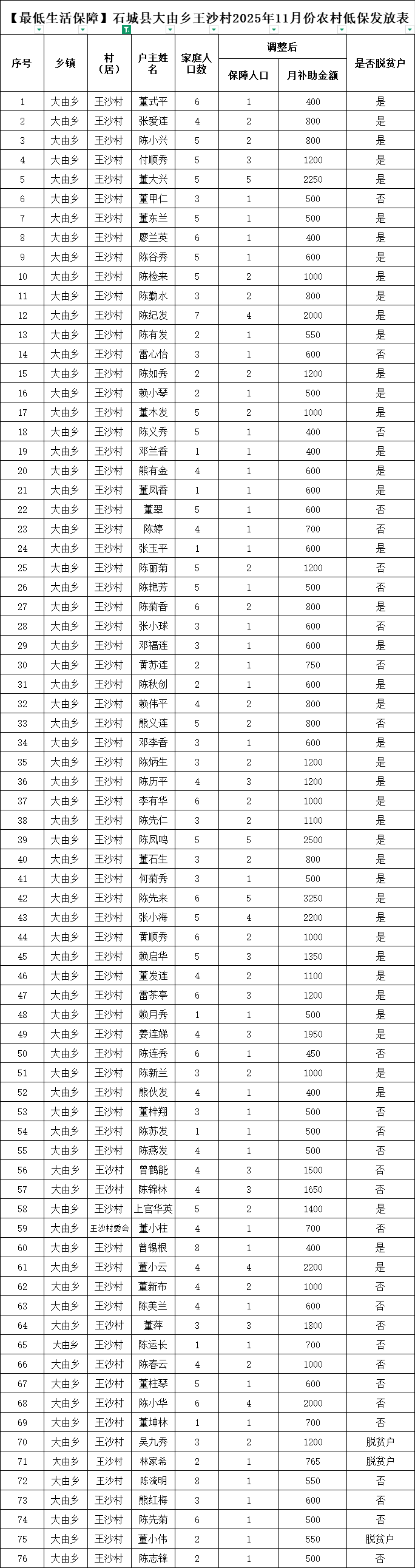 【最低生活保障】石城縣大由鄉(xiāng)王沙村2025年11月份農村低保發(fā)放表