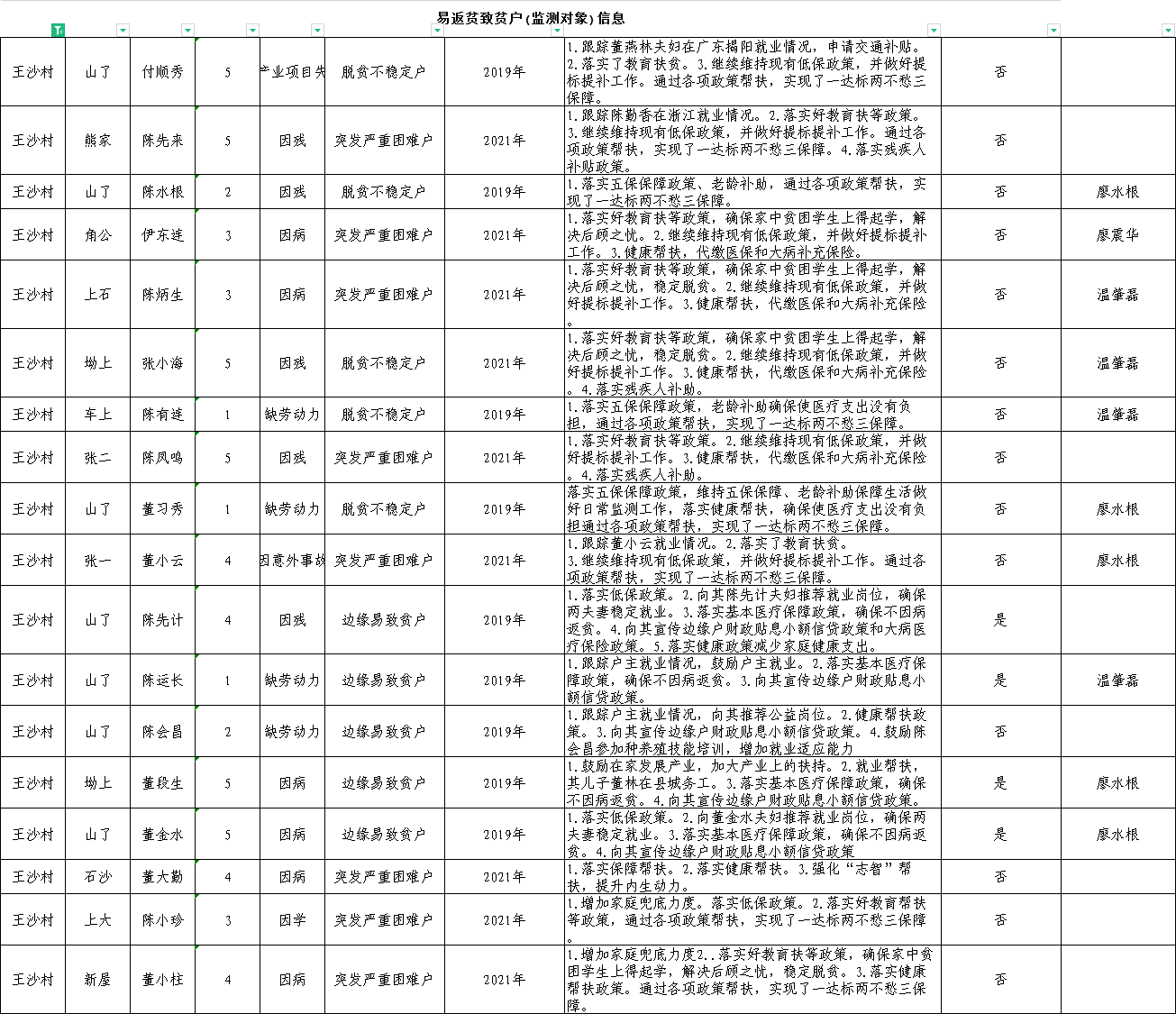王沙村易返貧致貧戶(監(jiān)測對象)信息