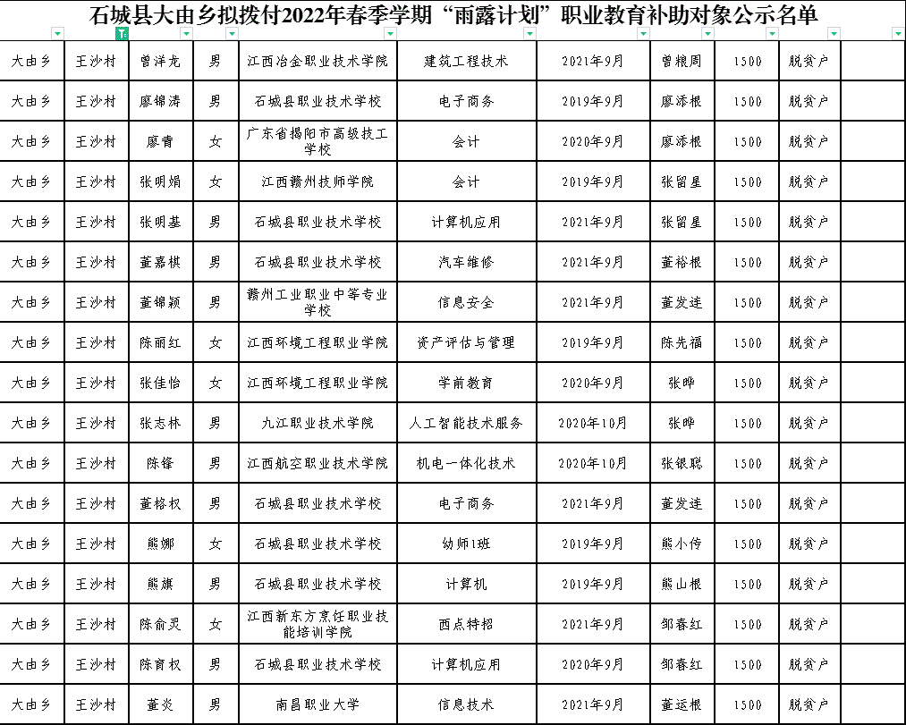 石城縣大由鄉(xiāng)王沙村擬撥付2022年春季學(xué)期“雨露計(jì)劃”職業(yè)教育補(bǔ)助對(duì)象公示名單