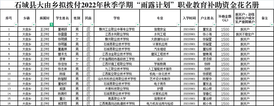 石城縣大由鄉(xiāng)王沙村擬撥付2022年秋季學(xué)期“雨露計(jì)劃”職業(yè)教育補(bǔ)助資金花名冊(cè)