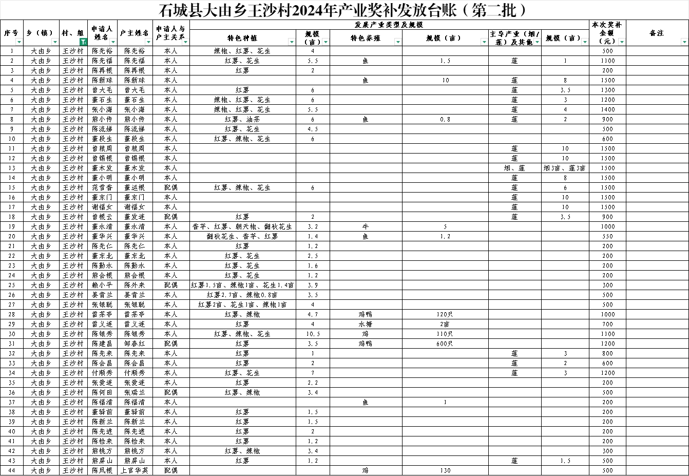石城縣大由鄉(xiāng)王沙村2024年產(chǎn)業(yè)獎補發(fā)放臺賬(第二批)