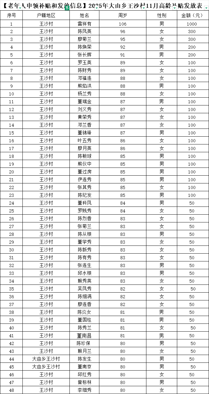 【老年人申領補貼和發(fā)放信息】2025年大由鄉(xiāng)王沙村11月高齡補貼發(fā)放表