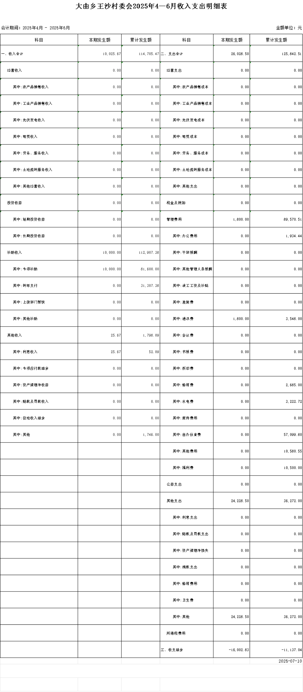 大由鄉(xiāng)王沙村委會(huì)2025年4—6月收入支出明細(xì)表
