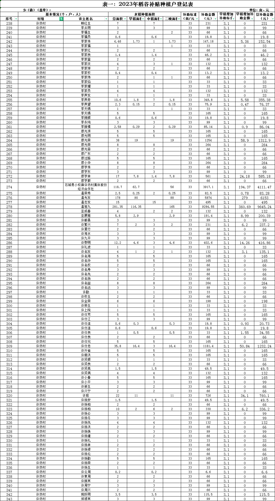 【產業(yè)扶持】許坊村2023年稻谷補貼種植戶公示表