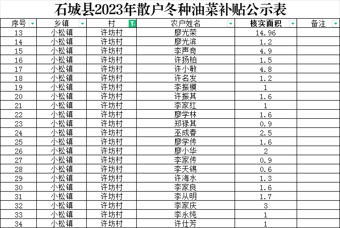 【涉農(nóng)補貼】石城縣小松鎮(zhèn)許坊村2023年冬種油菜補貼公示表