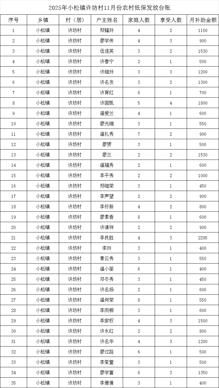 【最低生活保障】小松鎮(zhèn)許坊村2025年11月農(nóng)村低保發(fā)放公示