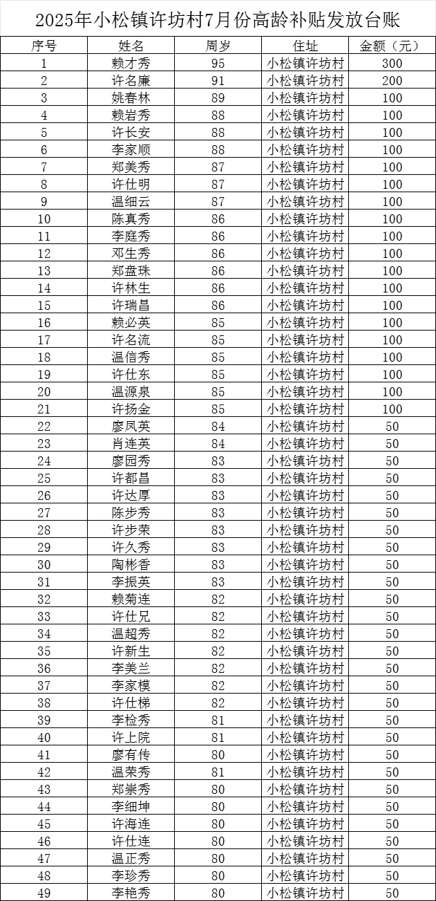 【老年人申領(lǐng)補(bǔ)貼和發(fā)放信息】石城縣小松鎮(zhèn)許坊村2025年7月高齡補(bǔ)貼發(fā)放公示表