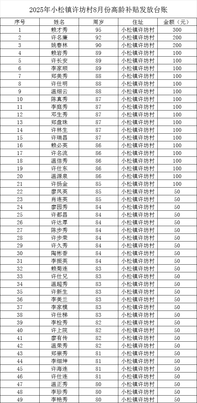 【老年人申領(lǐng)補(bǔ)貼和發(fā)放信息】石城縣小松鎮(zhèn)許坊村2025年8月高齡補(bǔ)貼發(fā)放公示表
