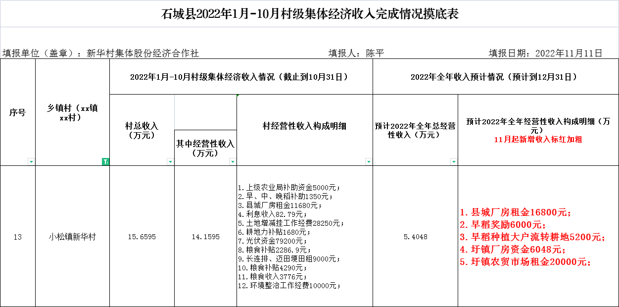 【集體統(tǒng)一經(jīng)營(yíng)的經(jīng)營(yíng)性資產(chǎn)】新華村2022年1-10月村集體經(jīng)濟(jì)收入情況公示表