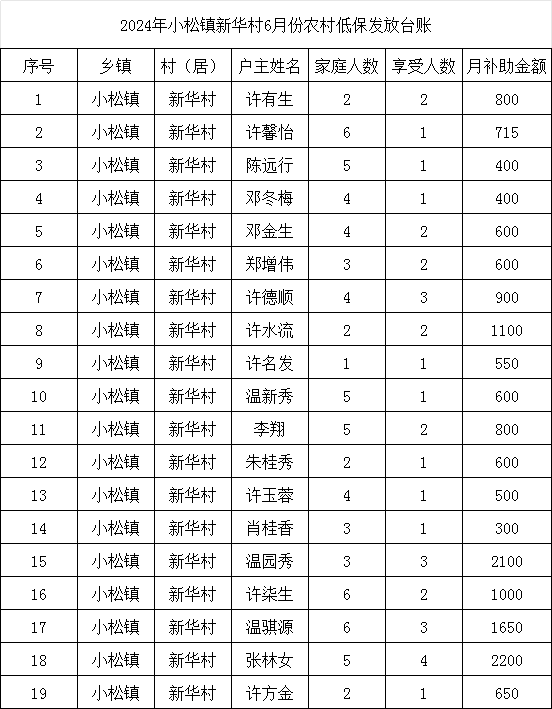 【最低生活保障】小松鎮(zhèn)新華村2024年6月農(nóng)村低保發(fā)放公示
