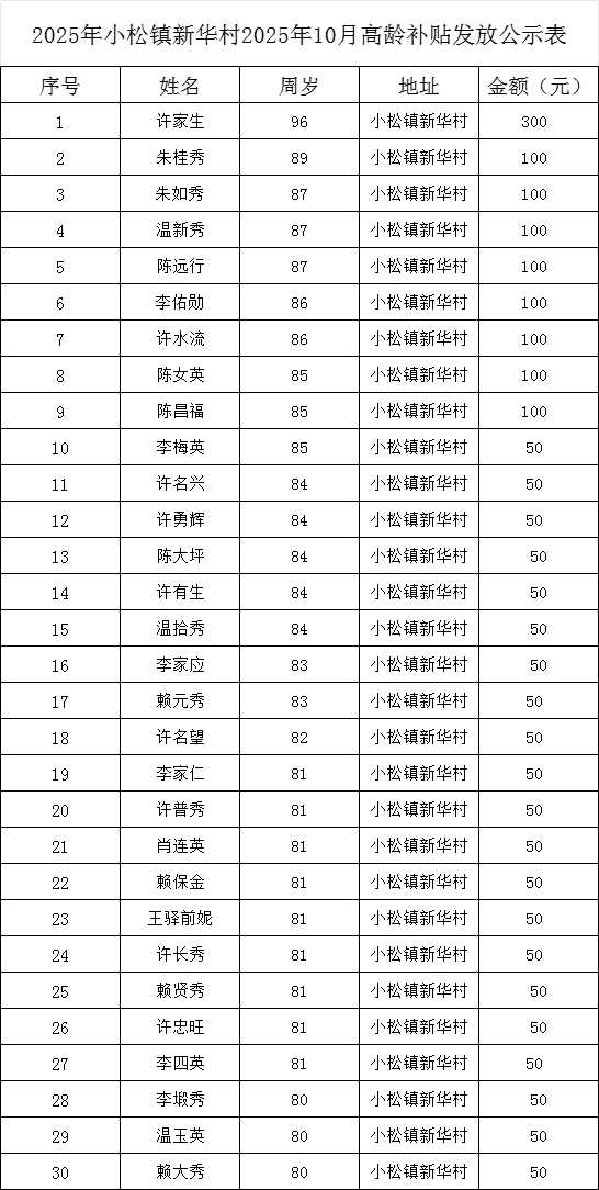 【老年人申領(lǐng)補(bǔ)貼和發(fā)放信息】石城縣小松鎮(zhèn)新華村2025年10月高齡補(bǔ)貼發(fā)放公示表