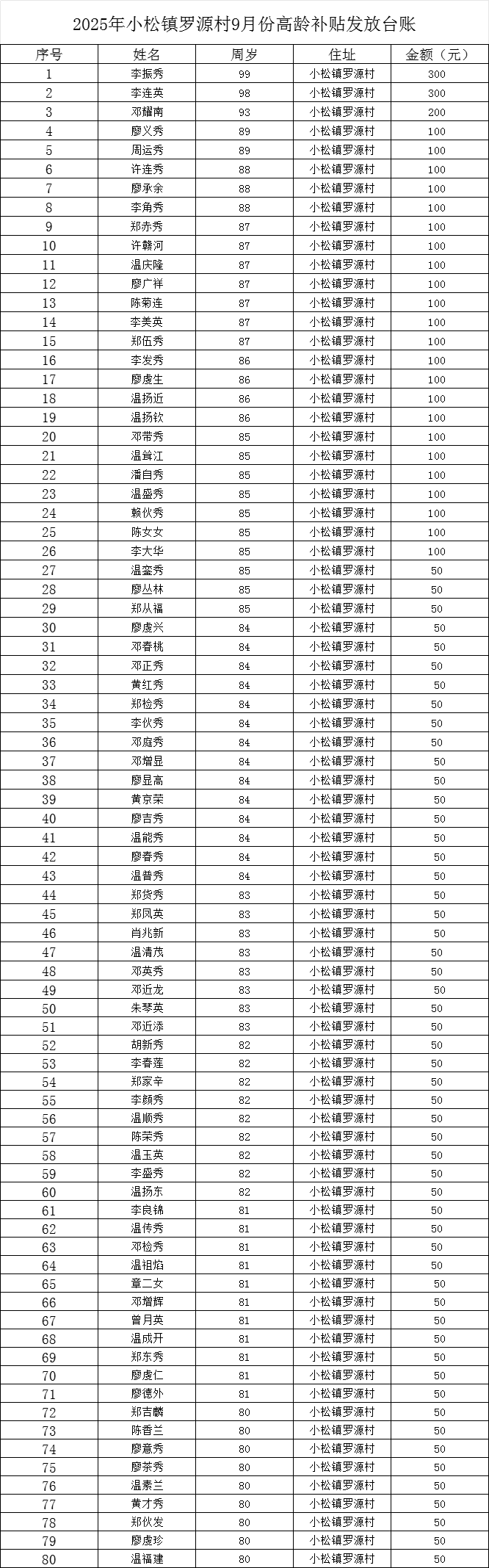 【老年人申領補貼和發(fā)放信息】石城縣小松鎮(zhèn)羅源村2025年9月高齡補貼發(fā)放公示表