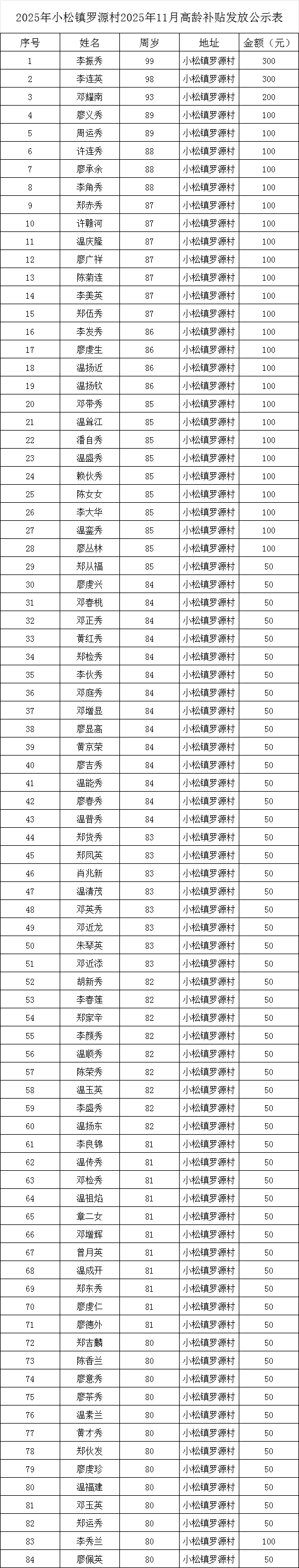【老年人申領(lǐng)補貼和發(fā)放信息】石城縣小松鎮(zhèn)羅源村2025年11月高齡補貼發(fā)放公示表