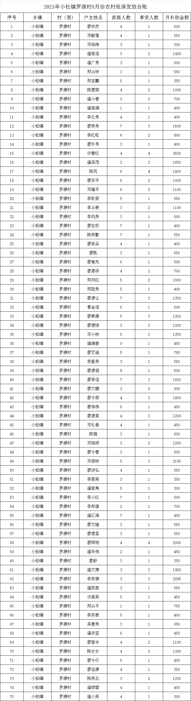 【最低生活保障】小松鎮(zhèn)羅源村2025年8月農(nóng)村低保發(fā)放公示