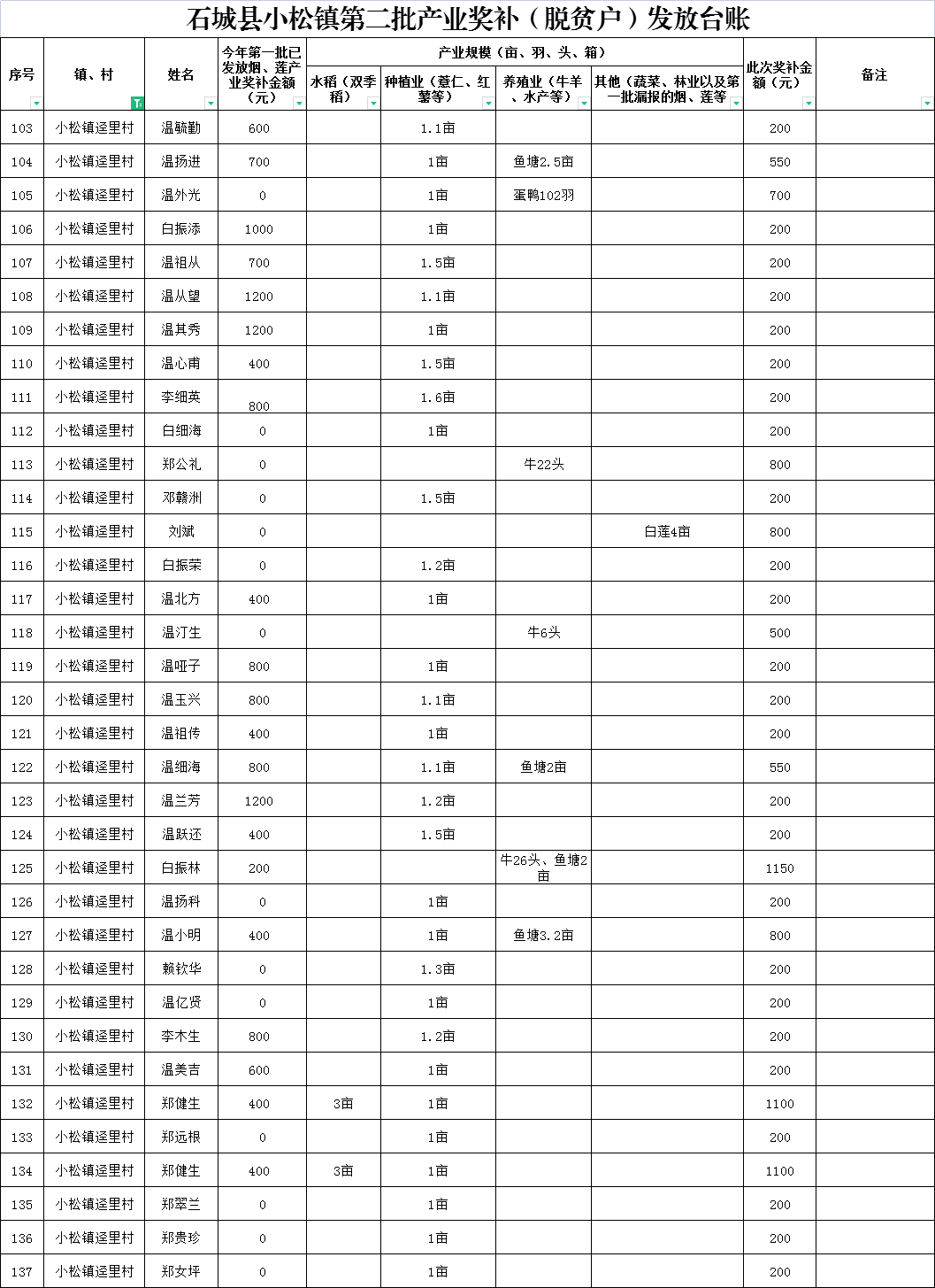【產(chǎn)業(yè)扶持】石城縣小松鎮(zhèn)逕里村第二批產(chǎn)業(yè)獎(jiǎng)補(bǔ)(脫貧戶)發(fā)放臺(tái)賬