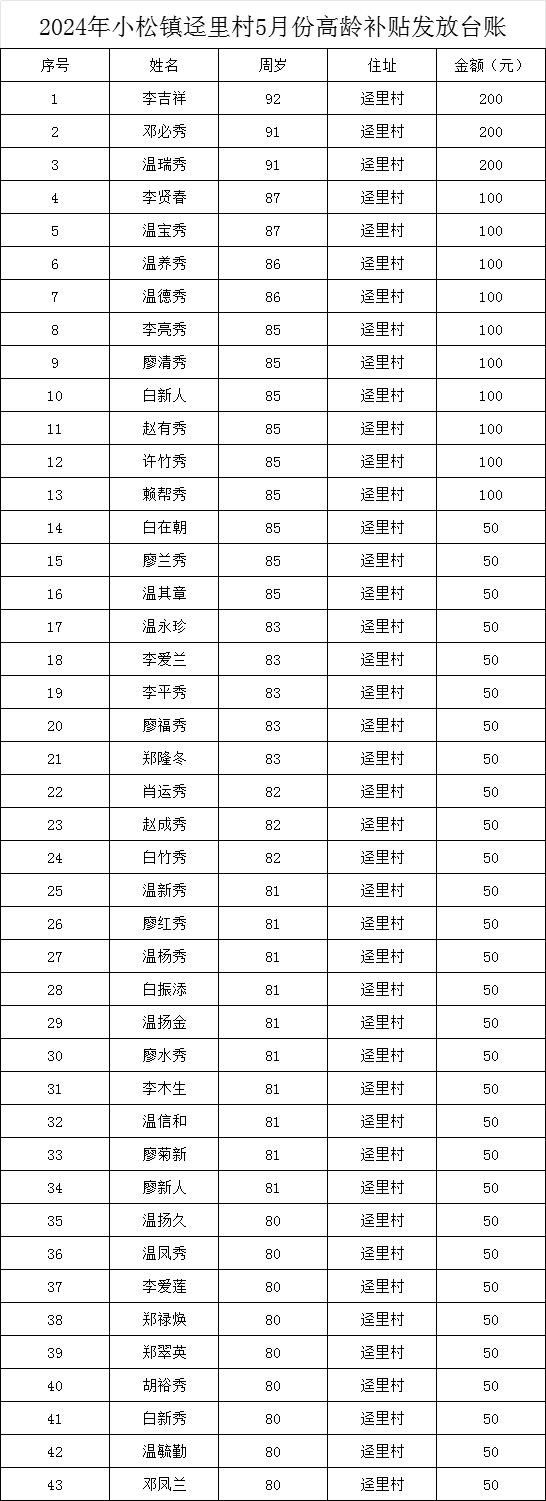 【老年人申領(lǐng)補貼和發(fā)放信息】石城縣小松鎮(zhèn)逕里村2024年5月高齡補貼發(fā)放公示表