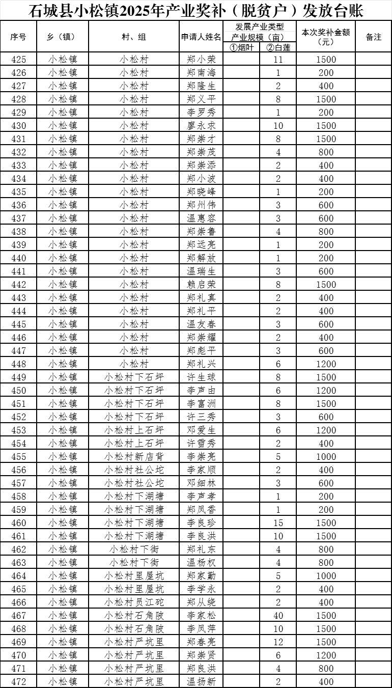石城縣小松鎮(zhèn)小松村2025年第一批產(chǎn)業(yè)獎(jiǎng)補(bǔ)發(fā)放臺(tái)賬
