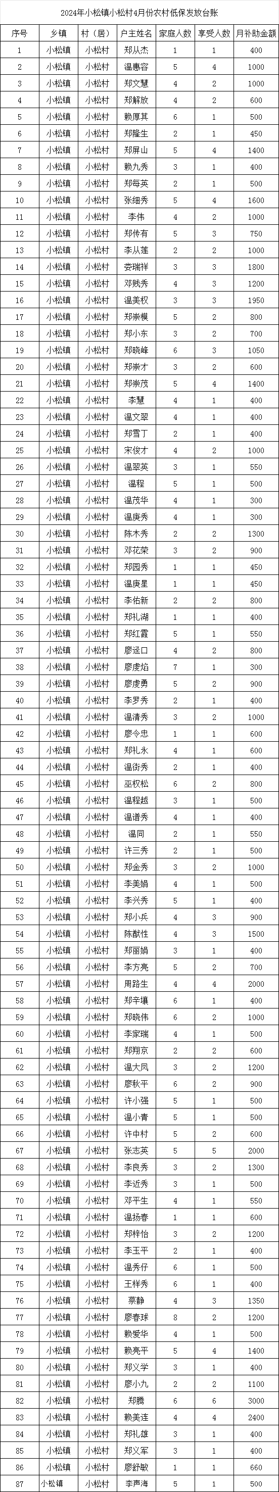 【最低生活保障】小松鎮(zhèn)小松村2024年4月農(nóng)村低保發(fā)放公示