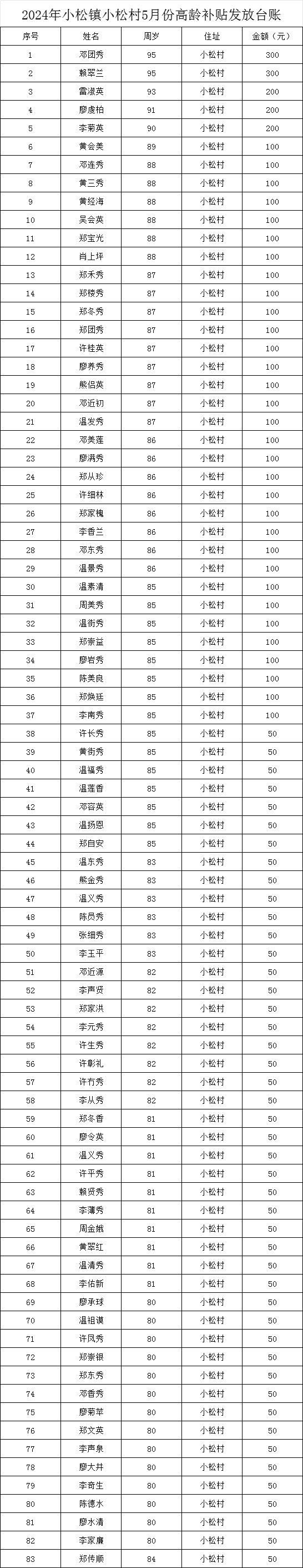 【老年人申領(lǐng)補(bǔ)貼和發(fā)放信息】石城縣小松鎮(zhèn)小松村2024年5月高齡補(bǔ)貼發(fā)放公示表