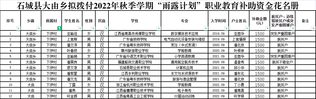 石城縣大由鄉(xiāng)下伊村擬撥付2022年秋季學(xué)期“雨露計(jì)劃”職業(yè)教育補(bǔ)助資金花名冊(cè)