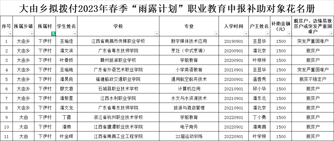 大由鄉(xiāng)下伊村擬撥付2023年春季“雨露計(jì)劃”職業(yè)教育申報(bào)補(bǔ)助對象花名冊