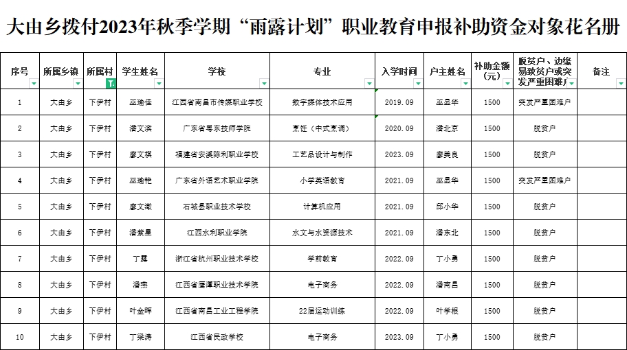 大由鄉(xiāng)下伊村撥付2023年秋季學(xué)期“雨露計(jì)劃”職業(yè)教育申報(bào)補(bǔ)助資金對(duì)象花名冊(cè)