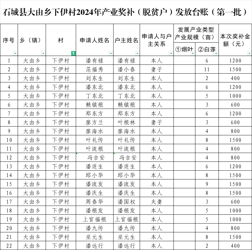 石城縣大由鄉(xiāng)下伊村2024年產(chǎn)業(yè)獎(jiǎng)補(bǔ)(脫貧戶)發(fā)放臺(tái)賬(第一批)