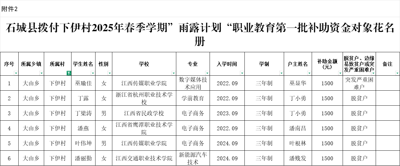 石城縣撥付下伊村2025年春季學(xué)期”雨露計(jì)劃“職業(yè)教育第一批補(bǔ)助資金對象花名冊