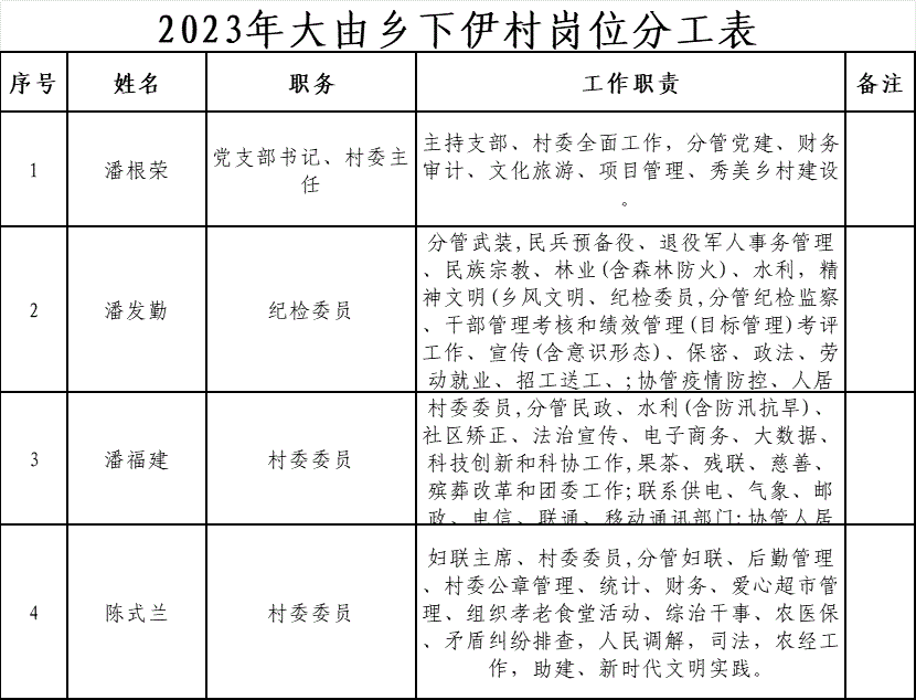 2023年大由鄉(xiāng)下伊村崗位分工表