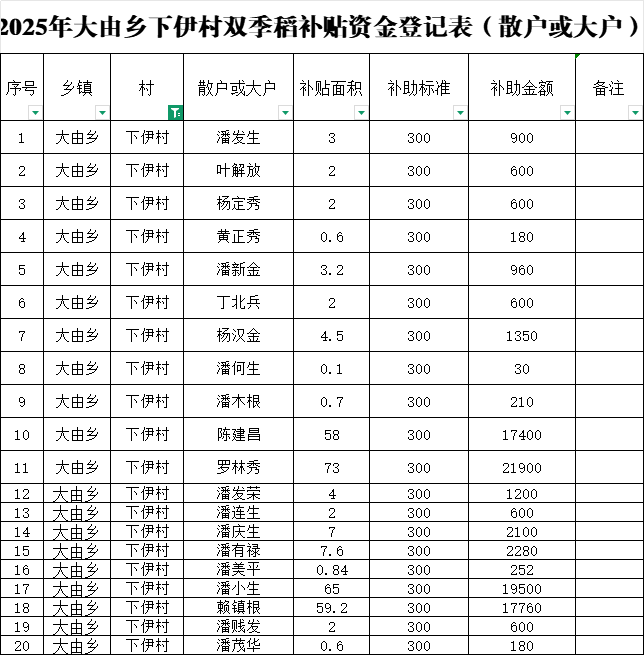 2025年大由鄉(xiāng)下伊村雙季稻補(bǔ)貼資金登記表(散戶或大戶)