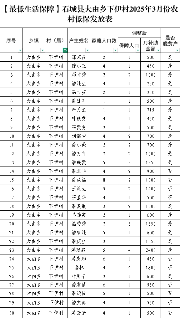 【最低生活保障】石城縣大由鄉(xiāng)下伊村2025年3月份農(nóng)村低保發(fā)放表