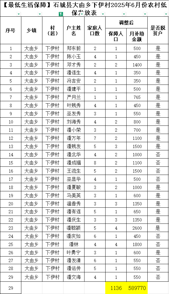 【最低生活保障】石城縣大由鄉(xiāng)下伊村2025年6月份農(nóng)村低保發(fā)放表