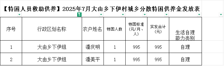 【特困人員救助供養(yǎng)】2025年7月大由鄉(xiāng)下伊村城鄉(xiāng)分散特困供養(yǎng)金發(fā)放表