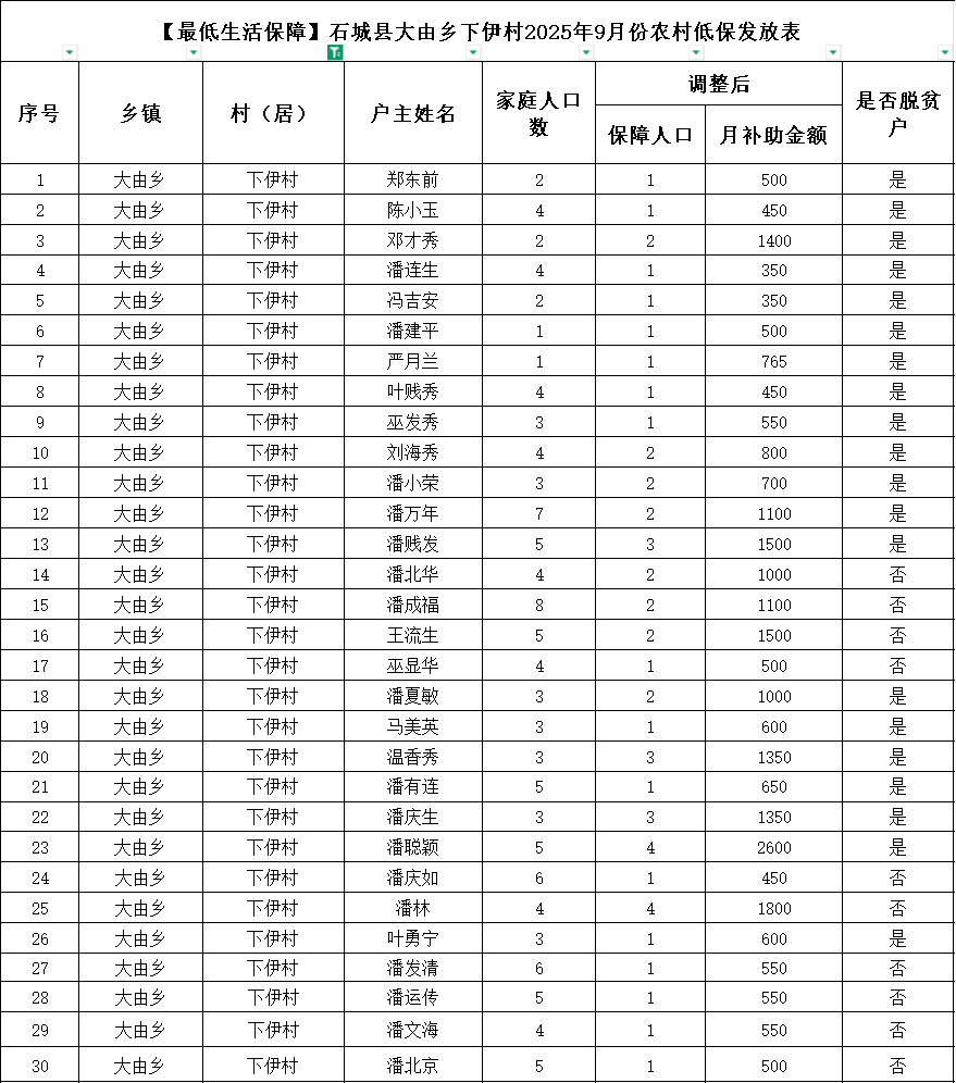 【最低生活保障】石城縣大由鄉(xiāng)下伊村2025年9月份農(nóng)村低保發(fā)放表
