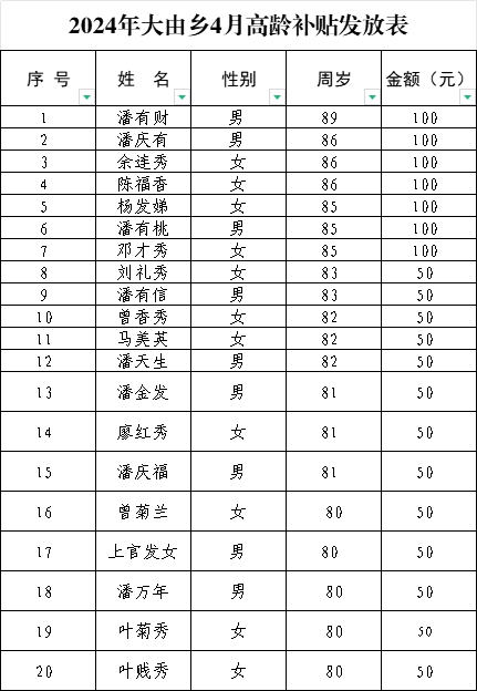 2024年大由鄉(xiāng)下伊村4月高齡補(bǔ)貼發(fā)放表