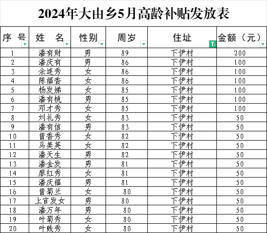 2024年大由鄉(xiāng)下伊村5月高齡補貼發(fā)放表