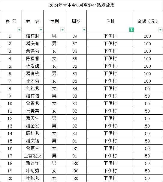 2024年大由鄉(xiāng)下伊村6月高齡補貼發(fā)放表