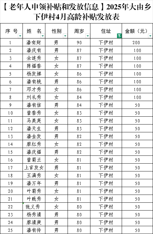 【老年人申領(lǐng)補(bǔ)貼和發(fā)放信息】2025年大由鄉(xiāng)下伊村4月高齡補(bǔ)貼發(fā)放表
