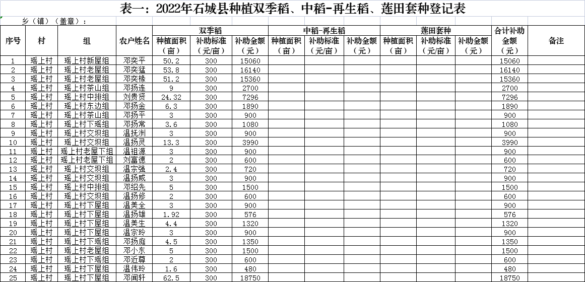 【產(chǎn)業(yè)扶持】瑤上村2022年種植雙季稻、中稻-再生稻、蓮田套種補(bǔ)貼公示表