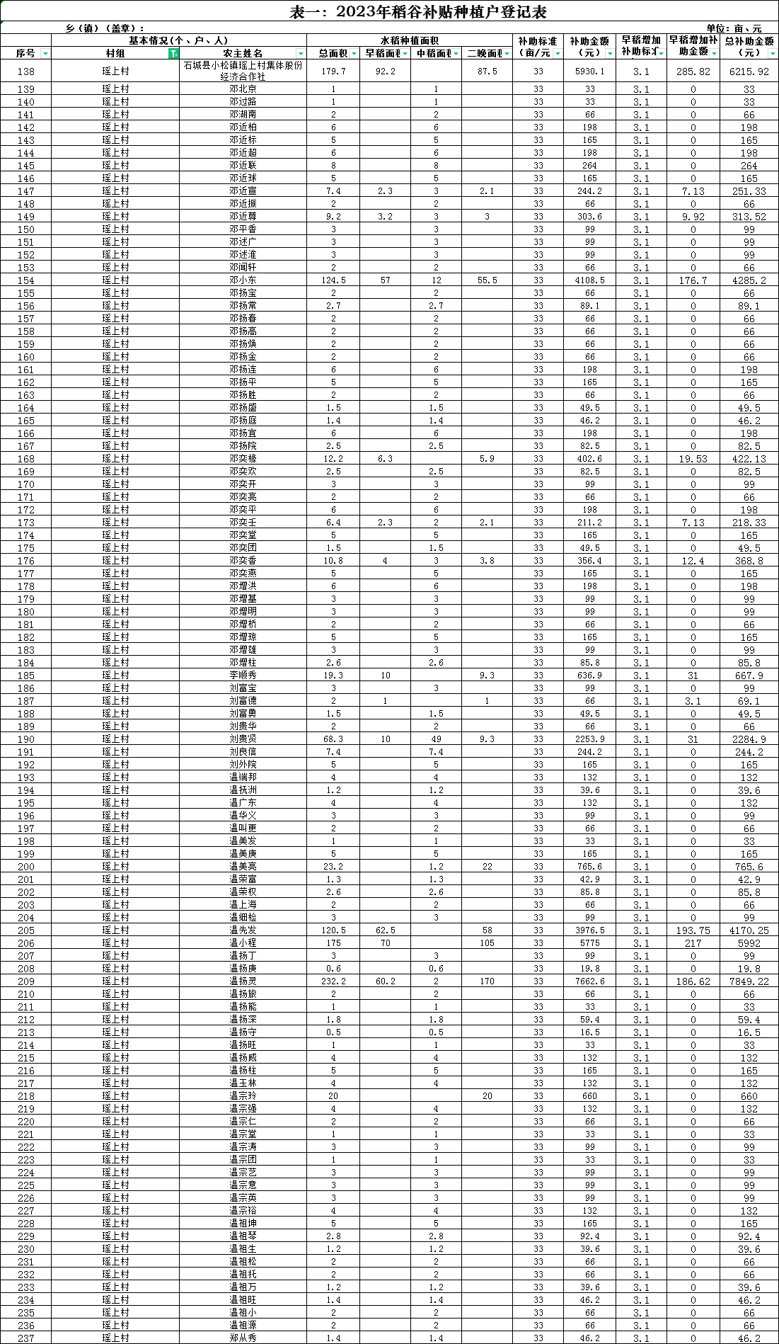 【產(chǎn)業(yè)扶持】瑤上村2023年稻谷補(bǔ)貼種植戶公示表