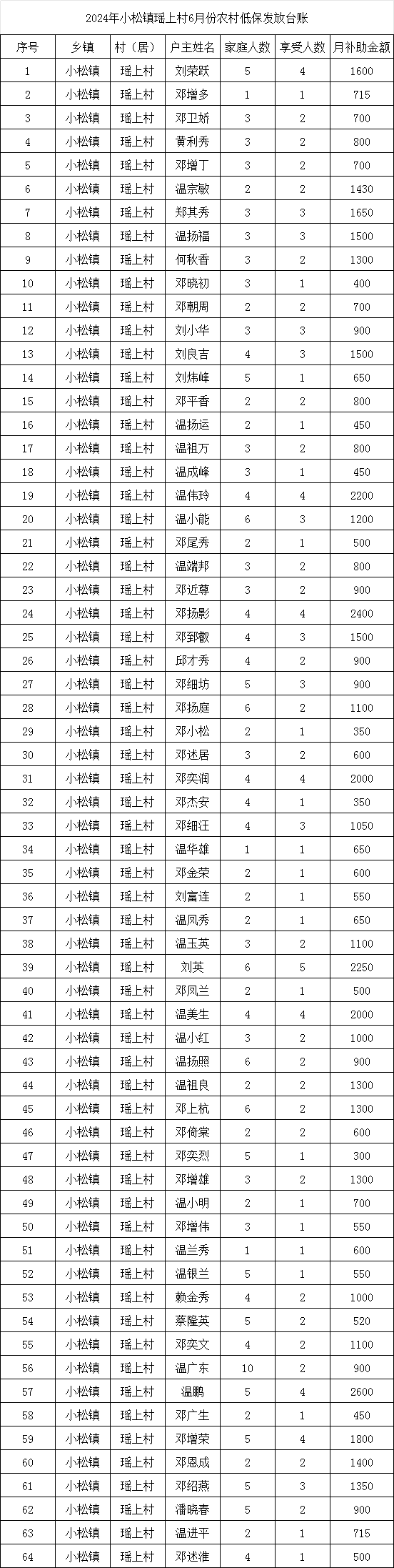 【最低生活保障】小松鎮(zhèn)瑤上村2024年6月農村低保發(fā)放公示