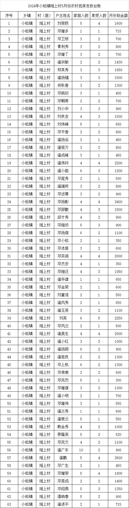 【最低生活保障】小松鎮(zhèn)瑤上村2024年5月農(nóng)村低保發(fā)放公示