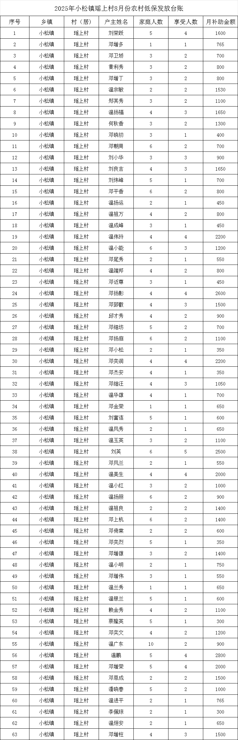 【最低生活保障】小松鎮(zhèn)瑤上村2025年8月農(nóng)村低保發(fā)放公示