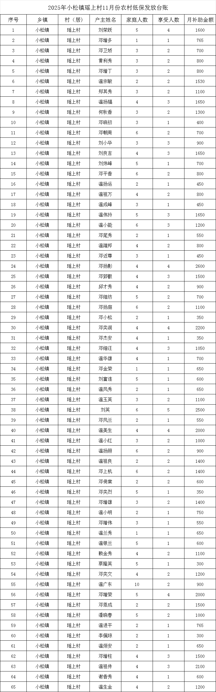【最低生活保障】小松鎮(zhèn)瑤上村2025年11月農(nóng)村低保發(fā)放公示