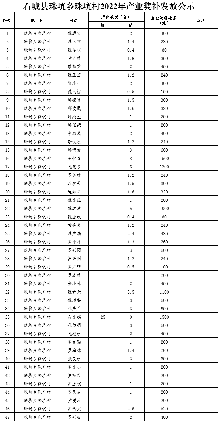 【涉農補貼】石城縣珠坑鄉(xiāng)珠坑村2022年產業(yè)獎補發(fā)放公示