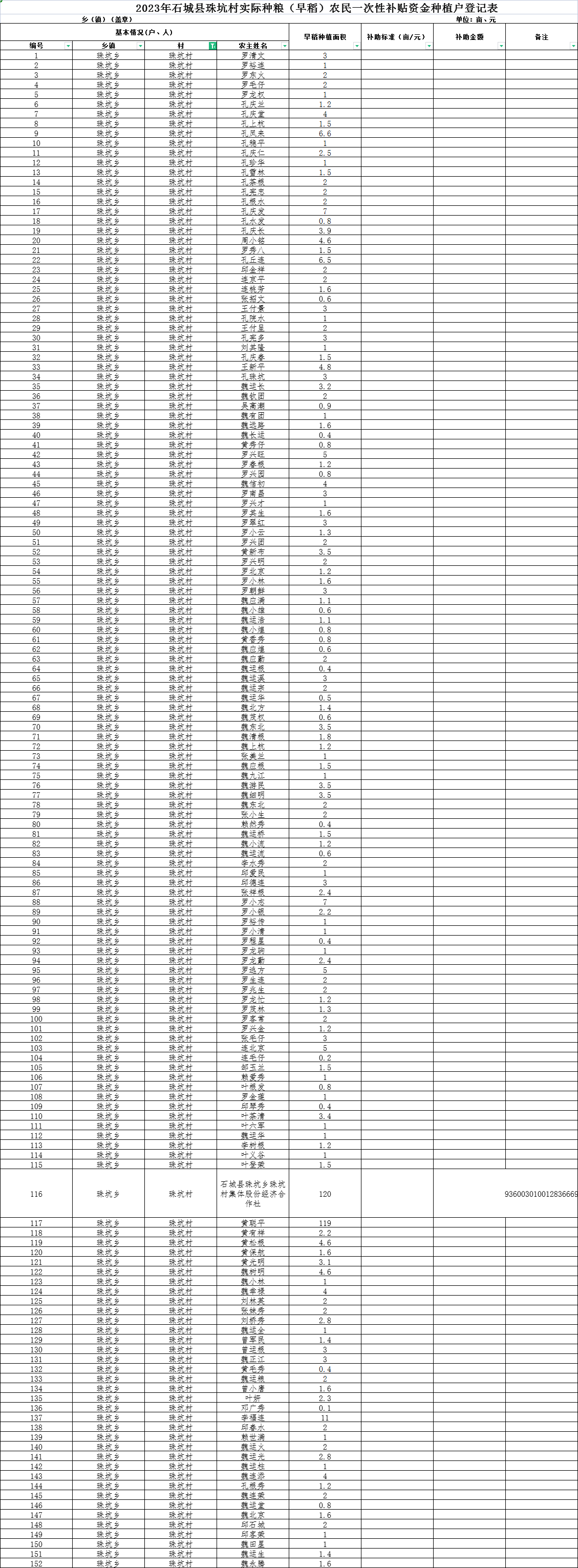 【涉農(nóng)補貼】 2023年石城縣珠坑村實際種糧(早稻)農(nóng)民一次性補貼資金種植戶登記表