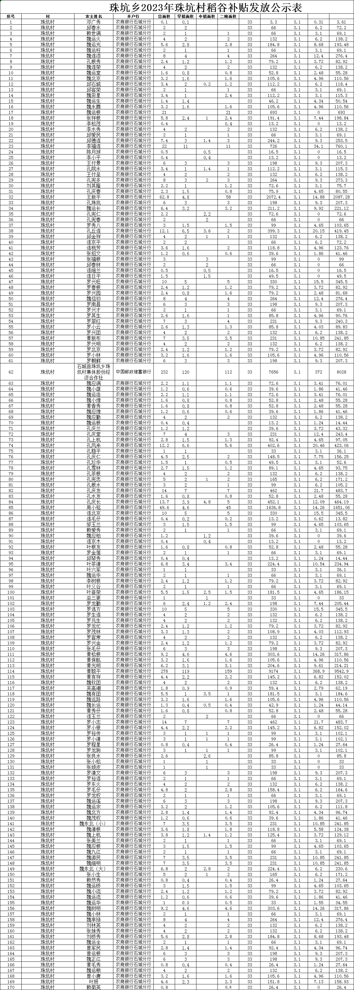 (涉農(nóng)補貼)珠坑鄉(xiāng)2023年珠坑村稻谷補貼發(fā)放公示表