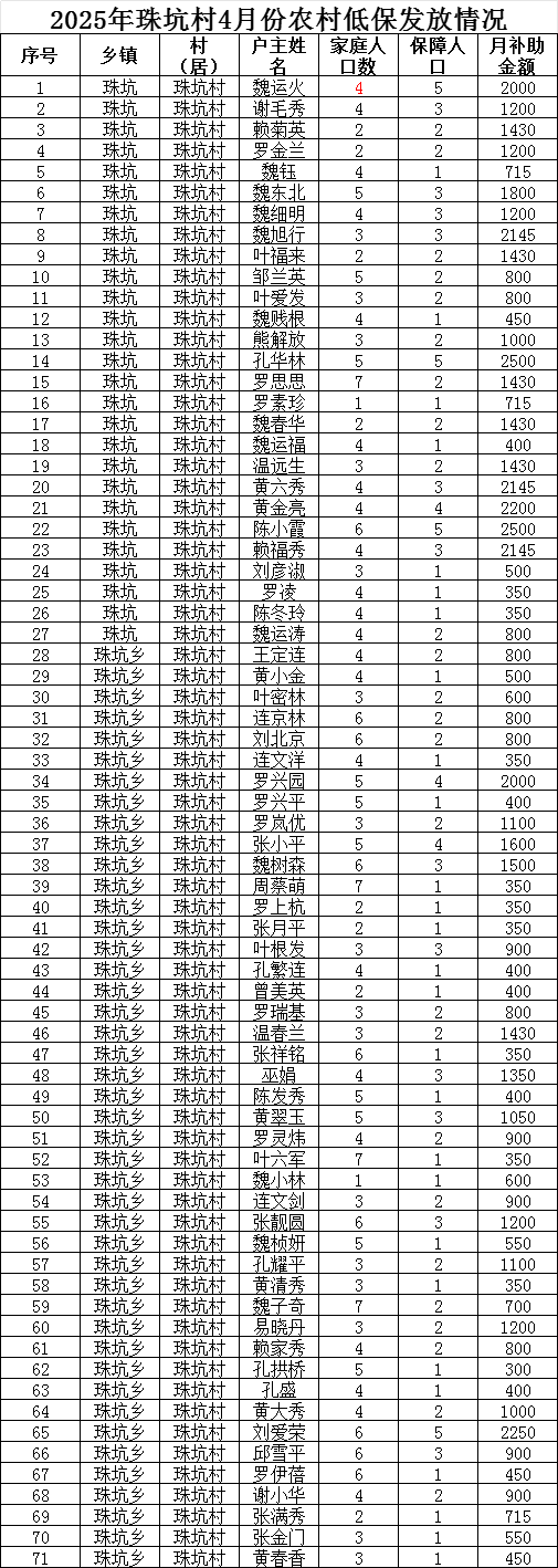 2025年珠坑村4月份農(nóng)村低保發(fā)放情況